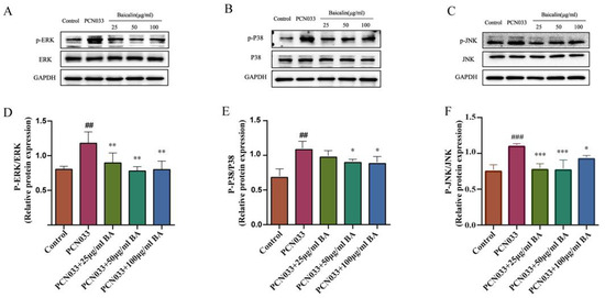 The effects of BA on PCN033-induced MAPK signaling pathways. (A,D) The levels of phosphorylated ERK (8 h). (B,E) The levels of phosphorylated P38 (8 h). (C,F) The levels of phosphorylated JNK (8 h). Western blot results show that the levels of phosphorylated ERK, P38, and JNK increased significantly after being infected with PCN033 and were inhibited significantly after treatment with BA (## p < 0.01 vs. control; ### p < 0.001 vs. control; * p < 0.05; ** p < 0.01; *** p < 0.001).