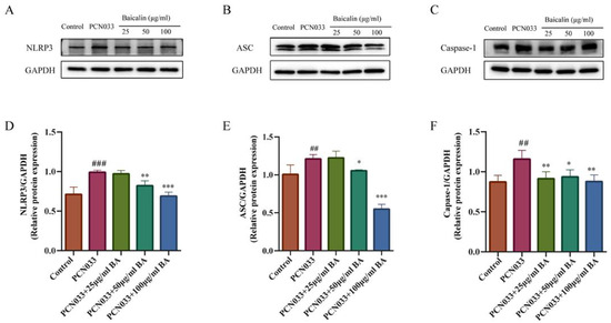 The effect of BA on the PCN033-induced NLRP3 inflammasome. (A,D) The expression of NLRP3 (8 h). (B,E) The expression levels of ASC (8 h). (C,F) The expression levels of phosphorylated Caspase-1 (8 h). The results show that the expressions of NLRP3, ASC, and Caspase-1 increased significantly after infection with PCN033 and were inhibited significantly after treatment with BA (## p < 0.01 vs. control; ### p < 0.001 vs. control; * p < 0.05; ** p < 0.01; *** p < 0.001).