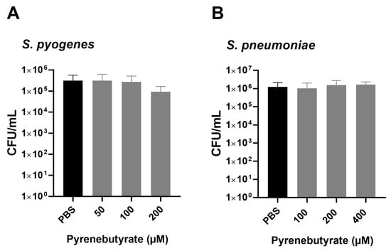 Toxicity of PyB to S. pyogenes and S. pneumoniae. (A) Treatment of S. pyogenes with 50–200 µM PyB for 6 h. (B) Treatment of S. pneumoniae with 50–400 µM PyB for 6 h. Data are presented as mean values with standard deviation. Statistical significance was determined by a one-way ANOVA, multiple comparisons. Sample size: n = 4.