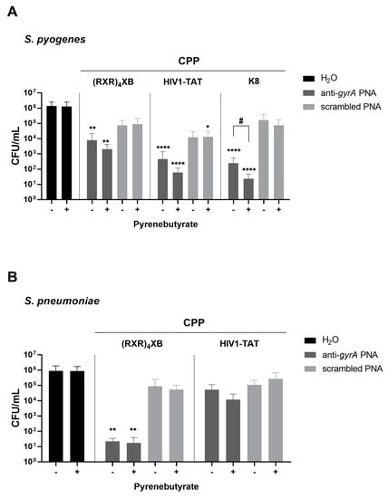 Reduction in bacterial CFU/mL following treatment with CPP-antisense PNAs for 6 h with or without pre-treatment with PyB. (A) Bacterial counts following treatment of S. pyogenes with 5 µM CPP-anti-gyrA PNA or 5 µM CPP-anti-gyrA scPNAs. (B) Bacterial counts following treatment of S. pneumoniae with 10 µM CPP-anti-gyrA PNA or 10 µM CPP-anti-gyrA scPNAs. Data are presented as mean values with standard deviation. Statistical significance was determined by a one-way ANOVA, multiple comparisons. Differences between PNA conjugate samples and mock control (untreated) were expressed as p ≤ 0.05 (*), p ≤ 0.01 (**) or p ≤ 0.0001 (****). Differences between PNA conjugate samples in the presence of PyB and PNA conjugate samples without PyB were expressed as p ≤ 0.05 (#). Sample size: n = 5.