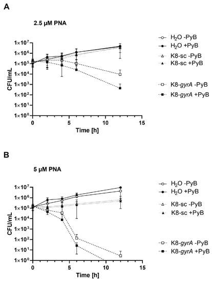 In S. pyogenes, addition of PyB resulted in the significantly increased antimicrobial activity of K8-anti-gyrA PNA. Therefore, the kinetics of the antimicrobial activity of K8-conjugated anti-gyrA PNA in the presence of PyB were studied in an in vitro time killing assay in S. pyogenes. Bacteria were treated with 2.5 or 5 μM CPP-antisense PNAs or scrambled control PNAs (Figure 3) with or without pre-treatment with 100 µM PyB. Samples were collected at 2, 4, 6, and 12 h following antisense treatment. CFUs per milliliter were determined by plating of serial dilutions and plotted over time. Untreated bacteria grew by 1–1.5 log CFU over the course of the experiment. Incubation with K8-anti-gyrA PNA resulted in a constant decrease in viable bacteria over time. However, S. pyogenes was not eradicated during the course of the assay (Figure 3A,B). In contrast, following pre-treatment with PyB, application of 5 µM K8- anti-gyrA PNA S. pyogenes CFUs steadily declined until clearance after 12 h (Figure 3B). Following treatment with 2.5 µM K8-conjugated scPNA, no reduction in bacterial counts was observed throughout the experiment. Upon treatment with 5 µM K8-conjugated scPNA, growth was reduced by 0.6 log CFU in comparison to the untreated control, indicating an inhibitory effect of the CPP under these conditions. Overall, pre-treatment with PyB enhanced the activity of K8-anti-gyrA PNA and allowed the eradication of S. pyogenes in vitro.