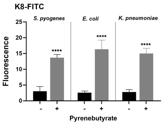 Since PyB enhanced the antibacterial effect of K8-anti-gyrA PNA in S. pyogenes, we hypothesized that uptake of K8 was facilitated in the presence of PyB. Therefore, we investigated uptake of K8-FITC into S. pyogenes with or without pre-treatment with 100 µM PyB for 10 min. Additionally, to study whether the uptake of K8-FITC is also facilitated by PyB in Gram-negative bacteria, we pre-incubated E. coli and K. pneumoniae with 100 µM PyB for 10 min before incubation with K8-FITC. Bacteria were incubated with 10 µM K8-FITC for 30 min, washed in PBS, and lysed. Subsequently, the fluorescence intensity of the bacterial cell lysates was measured with a fluorescence microplate reader in arbitrary units at excitation/emission wavelengths of 488 nm/521 nm. The fluorescence intensity of cell lysates from S. pyogenes incubated with K8-FITC increased 4.5-fold when the cells were pre-treated with PyB (Figure 4).