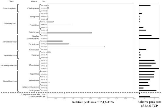Figure 1 shows the results of the GC/MS analysis on the TCA production and residual TCP in the screening test by the fungal isolates. The detailed results, including the appearances of the colonies, registered accession numbers, and identified genera, are shown in Table S1. The results of the TCA and TCP concentrations are shown as relative peak areas compared to those obtained for the reference vial bottles containing the potato dextrose agar supplemented with TCP. Trichoderma longibrachiatum NBRC 4847, a known TCA producer [,], showed a high TCA production and a lower concentration of residual TCP, while Saccharomyces cerevisiae INV SC1 presented a negative result. Among the isolates in this study, all the Trichoderma isolates showed high TCA productions, followed by two isolates out of the three Penicillium spp., one isolate out of the two Talaromyces spp., and one isolate out of the three Trametes spp. These were consistent with a previous observation [], where the genera (Trichoderma, Talaromyces, Penicillium, and Trametes) that produced high levels of TCA had filamentous morphologies under microscopic observation. In spite of the high consumptions of TCP by Aspergillus spp. and Trametes spp., the concentrations of TCA after incubation were very low, possibly because TCP was converted to other compounds, except for TCA, by these fungal isolates. Three Cladosporium spp. isolates produced negligible TCA despite relatively high consumptions of TCP. Geotrichum sp., Rhodotorula spp., and all isolates belonging to Tremellomycetes (Naganishia spp., Apiotrichum spp., Cutaneotrichosporon spp., and Trichosporon spp.) were incapable of consuming TCP, which resulted in negative TCA productions.
