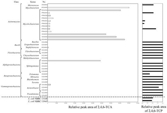 Figure 2 shows the results of the GC/MS analysis of the TCA production and residual TCP in the screening test of the bacterial isolates. The detailed results, including the appearances of the colonies, registered accession numbers, and identified genera, are shown in Table S2. The results on the TCA and TCP concentrations are shown as the relative peak area to those obtained for reference vial bottles containing R2A agar and supplemented with TCP. Two E. coli strains (NBRC 13168 and NBRC 13965) showed negative results. Among the 35 isolates in this study, the isolates with high TCA productions were concentrated on the Actinomycete members, which partly reflected the selectivity of the R2A agar and the bacterial population in the samples; moreover, all Mycolicibacterium and Mycobacterium isolates had high TCA productions. Notably, high TCA productions by actinomycetes is consistent with previous literature [,]. On the other hand, most Proteobacteria members, except for one isolate out of five Sphingomonas spp., produced negligible TCA. The exception (Sphingomonas) is consistent with previous literature, whereby the order Sphingomonadales is a known oxidative degrader of TCP [] and a known TCA producer []. The contribution of Sphingomonadales to the microbial conversion of TCP to TCA would be of importance because of a certain dominance of this species in drinking water distribution systems []. Although one isolate out of three Acinetobacter spp. showed a small amount of TCA production, and a considerable part of the added TCP remained in the agar. Other isolates, such as Micrococcus sp., Methylobacterium sp., Rheinheimera sp., Yersinia sp., Pseudomonas spp., and all isolates belonging to Bacilli (Bacillus sp., Exiguobacterium sp., and Staphylococcus sp.), Flavobacteriia (Flavobacterium spp. and Chryseobacterium sp.), and Betaproteobacteria (Pelomonas sp. and Mitsuaria sp.) were not capable of consuming TCP, meaning that they were negative for TCA production. The reason for the observed relative TCP peak areas, which were higher than 100%, was the decrease in pH that affected the extraction efficiency in the determination of TCP by the SPME method []. Unlike in the case of TCP (acidic molecule), the change in pH would only have a negligible effect on the judgment of TCA production in the screening test.
