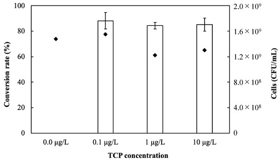 The conversion rates from TCP to TCA and the number of Mycolicibacterium sp. CB14 colonies in each TCP concentration. White bar: conversion rate of TCP to TCA; diamond: number of colonies.