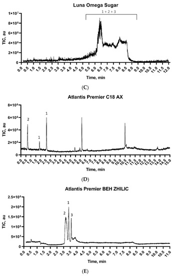 (A) Waters Acquity BEH Phenyl column (2.1 × 100 mm, 1.7 µm). Mobile phases were (MPA) 0.1% FA in ultrapure water and (MPB) MeOH. Gradient elution was used, and the flow rate was 300 µL/min. (B) Waters XBridge BEH Amide XP (3.0 × 150 mm, 2.5 µm). Mobile phases were (MPA) 80/20/0.05 MeCN/ultrapure water/DEA + 0.5 mg/L GuHCl and (MPB) (A) 90/5/5/0.05 MeCN/ultrapure water/isopropanol/DEA + 0.5 mg/L GuHCl. The gradient elution program was used, and the flow rate was 800 µL/min. The methodology was adapted from reference [19]. (C) Phenomenex Luna Omega Sugar (2.1 × 150 mm, 3 µm). The mobile phases were (MPA) 100 ultrapure water + 0.5 mg/L GuHCl and (MPB) 99/1 MeCN/ultrapure water + 0.5 mg/L GuHCl. The gradient elution program was used, and the flow rate was 313 µL/min. The methodology was adapted from reference [20]. (D) Waters Atlantis Premier BEH C18 AX (2.1 × 100 mm, 1.7 µm). The mobile phases were (MPA) 10 mM of AmFor in ultrapure water with pH = 3.75 and (MPB) 90/10 MeCN/10 mM AmFor in ultrapure water with pH = 3.75. The gradient elution program was used, and the flow was set to 300 µL/min. (E) Waters Atlantis Premier BEH Z-HILIC (2.1 × 150 mm, 1.7 µm). The mobile phases were (MPA) 20 mM of AmAc in ultrapure water with pH = 4.75 and (MPB) 90/10 MeCN/20 mM AmAc in ultrapure water with pH = 4.75. The gradient elution program was used, and the flow rate was set to 500 µL/min.