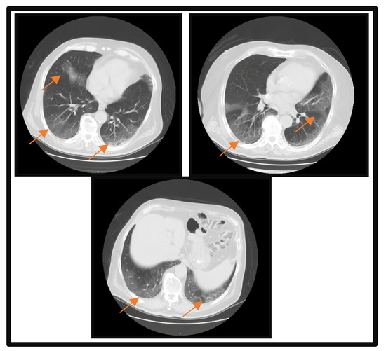 Pulmonary CT scan at the time of admission. Orange arrows highlight the lesion areas of condensation in the matt glass aspect.