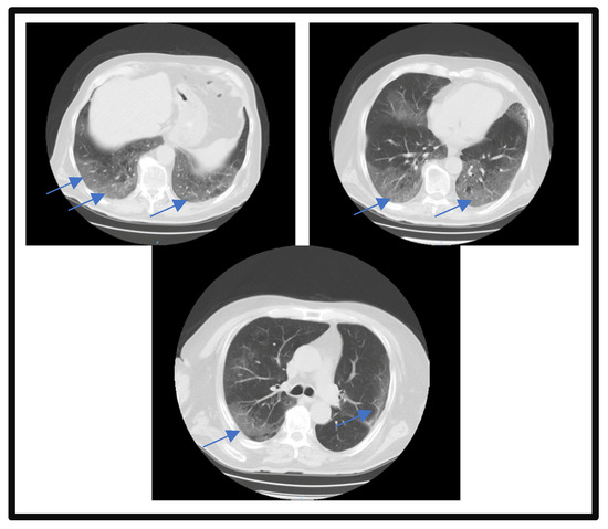 Pulmonary CT scan on the 3rd day of admission. Blue arrows highlight the lesion areas of condensation in the matt glass aspect.