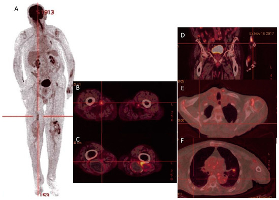 PET-scan (16 November 2017) showing hypermetabolism of the left radius (A), left and right popliteal aneurysms (B), left femoropopliteal bypass (C), the aorta, bilateral inguinal adenopathies (D), shoulders (E), left pulmonary nodule, and mitral valve (F).