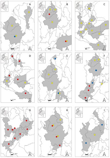 Furthermore, several serological studies have evidenced exposure to Ehrlichia spp. in Antioquia department among livestock farmers from the North and Magdalena Medio regions [] and San Pedro de Los Milagros municipality [], and among febrile patients from the Magdalena Medio region (Table 2) (Figure 1I) []. In addition, E. canis has been confirmed from dogs samples in several regions, including the Cauca department [], where a comprehensive study was performed, revealing that humans are not usually infected by this species []. Thus, these findings should reinforce surveillance studies to understand if Ehrlichia spp. could be an emerging human pathogen in Colombia.