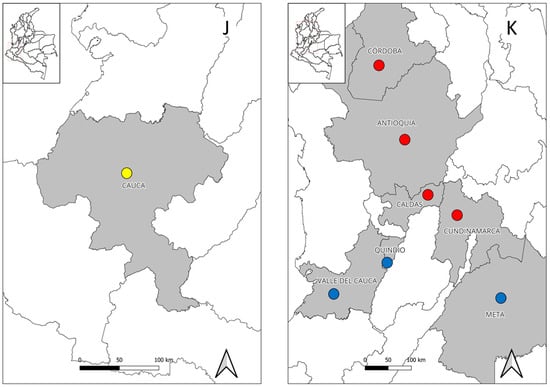 In Colombia, no attempt to detect the bacterium or the exposition to it was made until 2022, when a study found seropositivity to Orientia spp., confirmed with Western blot, among inhabitants of four municipalities of Cauca department (Table 2) (Figure 1J) [], which should encourage to perform more studies to establish if Orientia is part of febrile illnesses in the region, and if so, determine which species are involved, as well as its possible implications for Colombian public health or whether further surveillance by local health systems is warranted.