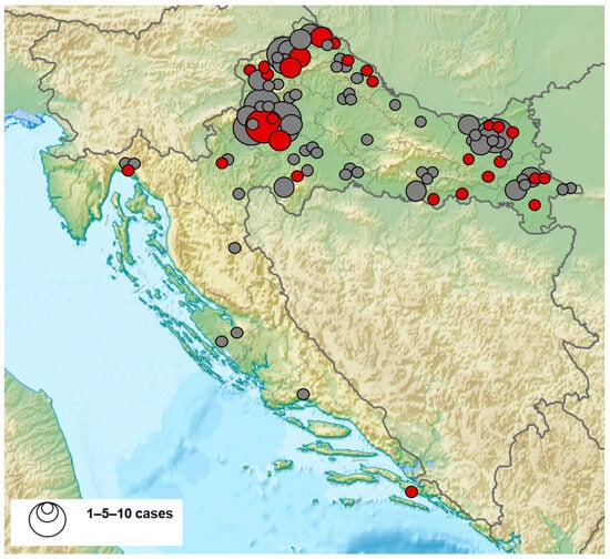 In Croatia, H. punctata, the main vector of BHAV, was recorded on ten different host species, mostly from ungulates, as well as one carnivore and one bird []. This species in Croatia was mainly recorded in localities in the Mediterranean biogeographic region, islands (Brač, Cres, Hvar, Krk, Lošinj), and in a littoral belt from Pula to Dubrovnik [,,,,,,,]. Recently, it was recorded at two localities in the Alpine biogeographic region (Gumance–Smrekova Draga, Kurjak-Udbina) [,] and six localities in the Continental biogeographic region (Donji Miholjac, Goričan, Koprivnica, Virovitica, Primišlje, and Požega) [,,]. The first record of this species in the continental biogeographical region was made almost eighty years ago at localities of Gornja Posavina in an irregular quadrilateral Zagreb-Karlovac-Sisak (Petrinja)–Bjelovar [].