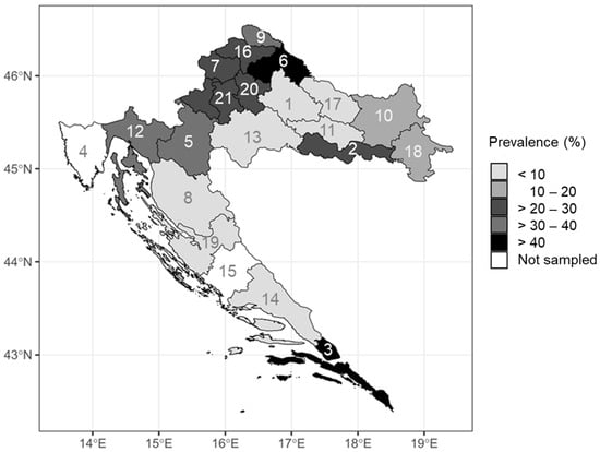 Bhanja bandavirus prevalence rates according to region (numbers in the map represent county labels).