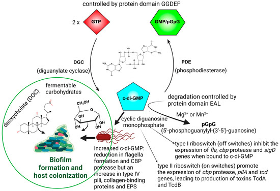 Increased production of c-di-GMP represses motility and stimulates biofilm formation [25]. The synthesis of c-di-GMP is controlled by the protein domain GGDEF, which is widely present in free-living bacteria [26,27,28,29]. Increased c-di-GMP levels reduce the expression of tcdA, tcdB, and tcdR [25,26,27,28,29,30]. The tcdR gene encodes an alternative sigma factor SigD (FliA; σ28) that activates the expression of tcdA and tcdB in response to c-di-GMP [25,30]. Degradation of c-di-GMP is controlled by the protein domain EAL (Figure 1) [26,27,28,29].