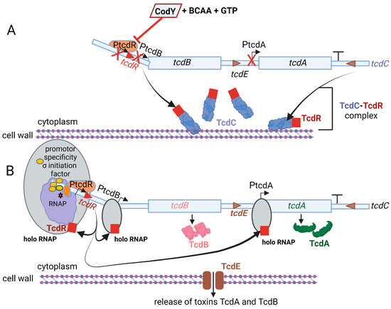 Pathogenicity locus (PaLoc) of C. difficile and regulation of toxin gene expression. For simplicity, genes in the PaLoc are depicted as light-blue rectangles. (A) During logarithmic growth, tcdA, tcdB, and tcdR (boxed) are expressed at low levels, regulated by a TcdR-independent promoter (PtcdR, orange). In the presence of GTP (guanosine triphosphate) and BCAAs (branched-chain amino acids, e.g., leucine, isoleucine, and valine), CodY (a transcriptional regulator of sporulation) binds to PtcdR and suppresses the expression of tcdR. This also leads to low expression of toxin genes tcdA and tcdB. The negative regulator gene, tcdC (on far right), is maximally expressed to produce the membrane-associated protein TcdC (in purple). The latter insulates minute amounts of TcdR (red squares) that may be expressed and further suppresses the expression of toxin genes. (B) During stationary (nutrient-limiting conditions or stress), the expression of toxin genes is induced. RNAP (depicted as a large purple circle), with an active site (red star), binds to a promoter-specificity σ initiation factor, also called the σ-specificity factor (yellow circle). The resulting holo RNAP (large gray circle on the left) reacts with promoters PtcdR, PtcdB, and PtcdA, respectively. The double-stranded DNA is loosely bound on the surface of RNAP. The two smaller gray circles also represent holo RNAP. In the absence of GTP and BCAA, CodY (not shown here) does not bind to PtcdR, and tcdR expression occurs unhindered. The tcdC gene (on far right) is not optimally expressed, which means TcdR is free to interact with RNAP and form the holozyme complex. The latter binds to the tcdR promoter (PtcdR) and promotors PtcdB and PtcdA, leading to maximal expression of tcdA, tcdB, and tcdR and thus high levels of toxins TcdA and TcdB. TcdE, a holin-like protein (depicted as brown rectangles in cell wall), facilitates the release of toxins TcdA and TcdB. This illustration was made using BioRender (https://biorender.com/), accessed on 3 April 2023.