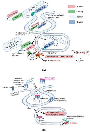 Both toxins, TcdA and TcdB, are composed of multimodular structures (a glucosyltransferase domain, GTD; cysteine protease domain, CPD; translocation domain, TD; and combined repetitive oligopeptide, CROP domain), as shown in Figure 4. The CROP domain at the C terminal is also referred to as the receptor-binding domain (RBD). Both toxins inactivate Rho- and Ras-GTPases in the host cytosol via mono-O-glucosylation (Figure 4). This leads to the disruption of tight junctions between intestinal cells, immune modulation [91], and inactivation of enzymes such as phospholipase D [92], protein and lipid kinases, and nicotinamide adenine dinucleotide-oxidase [93,94,95]. Inactivation of Rho proteins also leads to the induction of apoptosis [96], prevention of gene transcription, and the inhibition of phagocytosis [97], G1 cell cycle progression, microtubule dynamics, and vesicular transport pathways [93,94,95]. Notable symptoms caused by TcdA and TcdB are diarrhea, pseudomembranous colitis, and toxic megacolon [98,99].