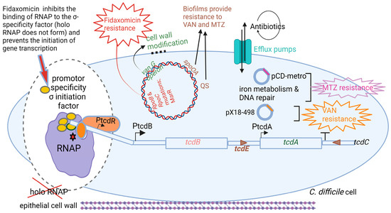Resistance mechanisms C. difficile developed against metronidazole (MTZ), vancomycin (VAN), and fidaxomicin. Resistance to MTZ is encoded by plasmid pCD-metro and genes involved in iron and redox metabolism. VAN resistance is either encoded by plasmid pX18-498 or the vanG operon that modifies the peptidoglycan by replacing the terminal D-Ala with D-Ser. Mutations in rpoB, rpoC, and MarR homolog CD2212 lead to resistance to fidaxomicin. Cells in biofilm are less affected by MTZ and VAN. Deletion of the ATP-binding cassette transporter CD2068 in efflux pumps reduces the activity of MTZ 1.4-fold. This illustration was made using BioRender (https://biorender.com/), accessed on 11 May 2023.