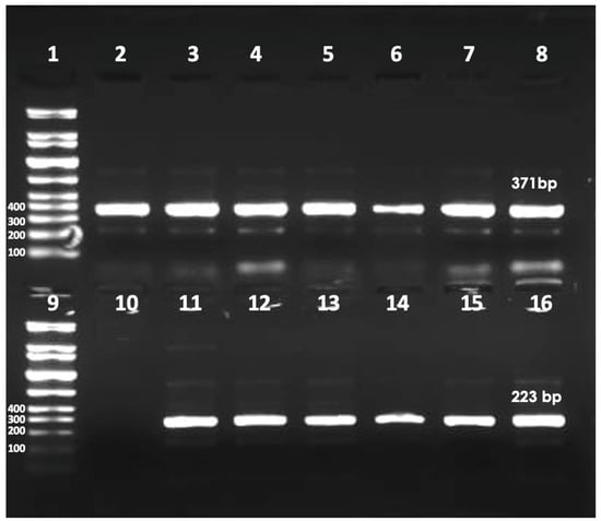 PCR products were examined in 1.5% agarose gel. In a glass flask, 0.75 g of agarose were dissolved in 50 mL of 1X Tris-Acetate-EDTA (TAE) buffer solution. The mixture was heated for one minute in the microwave. The gel casting tray was assembled, and the comb was placed above the tray’s surface. Ethidium bromide 4 μL (10 mg/mL) was added to the agarose mixture after it had cooled to ≈40 °C. Afterward, the gel was poured into the casting tray and allowed to solidify at room temperature. The electrophoresis chamber was filled with 1× TAE buffer, and the gel was placed in the electrophoresis chamber. Sample wells were loaded with 10 μL of PCR products mixed with 2 μL (abm Canada, Richmond, BC, Canada, cat#G030) of loading dye. Six µL of DNA ladder (Gilpilot® Wide Range Ladder 100 bps cat#239125) was loaded, and the apparatus lid was connected to the power source. The electrophoresis was performed at 100 volts for 30 min. The gel was visualized and photographed using the gel documentation system (BIO-RAD, Hercules, CA, USA).