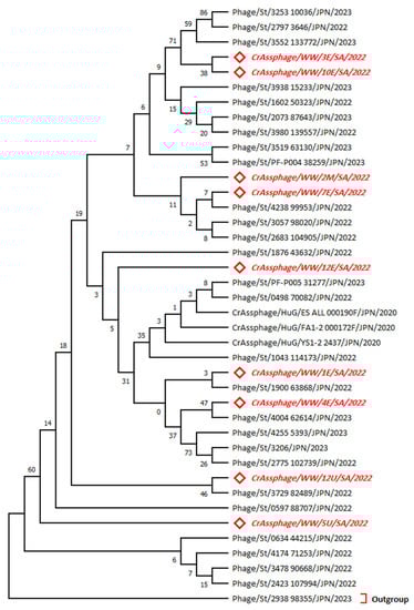 A phylogenetic tree (Figure 2) was constructed based on the nucleotide sequences of the major capsid gene region in all nine field isolates of crAssphage. The highest log likelihood tree is displayed (−702.50). The percentage of trees in which the associated taxa clustered together are provided at each branch. The rate variation model allowed for some sites to be evolutionarily invariable ([+I], 47.71% sites), according to the best-fitting substitution model validation. The horizontal distance is expressed as the number of nucleotide substitutions per site. The isolate 2938_98355 was used as an outgroup. Accession numbers of sequences used for the phylogenetic analysis are displayed in the Supplementary Materials.