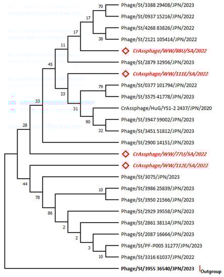 A phylogenetic tree (Figure 3) was constructed based on the nucleotide sequences of the membrane protein containing a peptidoglycan-binding protein region in all four isolates of crAssphage. The highest log likelihood tree is displayed (−457.77). The percentage of trees in which the associated taxa clustered together are provided at each branch. The rate variation model allowed for some sites to be evolutionarily invariable ([+I], 60.25% sites), according to the best-fitting substitution model validation. There were a total of 223 positions in the final dataset. The horizontal distance is expressed as the number of nucleotide substitutions per site. The isolate 3955_36450 was used as an outgroup. Accession numbers of sequences used for the phylogenetic analysis are displayed in the Supplementary Materials. All samples positive for crAssphage were sequenced and compared to sequences available in the GenBank database with the BLAST tool. The genetic tree analysis for the MP-PBD gene showed the isolate clustering to other isolates from Japan. The crAssphage 88U isolate showed a distance of (d = 0.0100) in evolutionary divergence with the 3388 29408, 0937 15216, and 2121 105414 isolates (Supplementary Data).