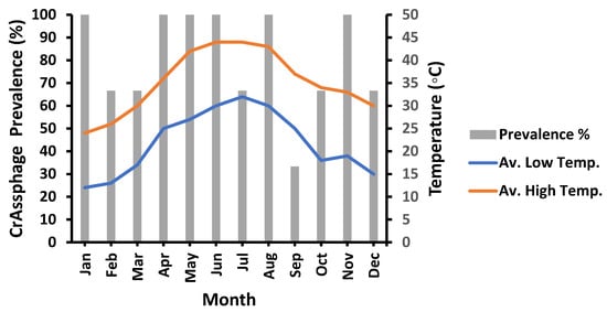 The impact of temperature on the prevalence of crAssphage was investigated by linking the prevalence and the average high or low temperature of the sampling day. According to the data presented in Figure 4, the prevalence of crAssphage was found to be 100% in January, April, May, June, August, and November at the three sampling locations. In contrast, the lowest crAssphage prevalence (33%) was detected in September with temperature ranges of (25–37 °C).