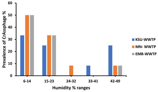 In all sampling locations, crAssphage favored the lowest relative humidity ranges (6–14%), with a prevalence of 50% in MN and EMB WWTPs and a prevalence of 33.3% in KSU WWTP (Figure 5). On the other hand, crAssphage was not detected at the humidity range (24–32) in both KSU-WWTP and EMB-WWTP. Also, crAssphage was not detected in MN-WWTP and EMB-WWTP in the (33–41) humidity range (Figure 5). At different humidity ranges, crAssphage prevalence significantly varied, highlighting the importance of relative humidity in determining crAssphage prevalence in raw water from WWTPs (p < 0.0004; Table 3).