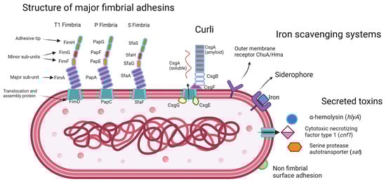 Moreover, the ability of UPEC to acquire iron is highly dependent on siderophore-iron transporter proteins [33]. These proteins enable UPEC to scavenge iron from the host and other sources, which is essential for bacterial growth and survival in the environment of the urinary tract where iron levels are infinitesimal [33]. A representative set of the virulence factors that can be expressed by UPEC are shown in Figure 1.