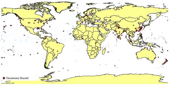 The occurrence records were filtered out to only include those with longitude and latitude coordinates recorded, and then further filtered out to remove suspicious unverified occurrence records. The longitude and latitude coordinates were then saved in the CSV file format for compatibility with the MaxEnt application that was used for modeling. A total of 1044 final occurrence records were used in this study (Figure 1).