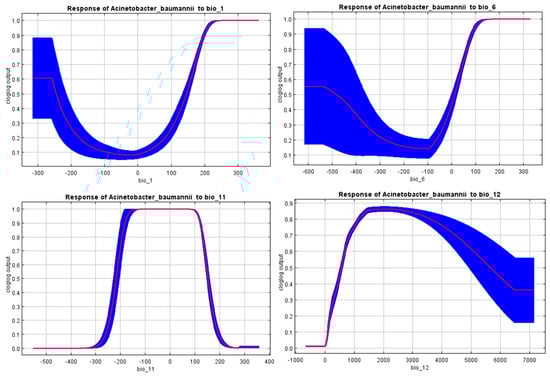 First, a preliminary model was constructed using all 19 historic bioclimatic variables to determine the variables that are the most powerful contributors to the model or the most powerful predictors. The use of bioclimatic factors 8, 9, 18, and 19 was avoided during variable selection due to known spatial artifacts and discontinuities [46], which may adversely impact the model quality. The factors were selected through an interpretation of the response curves as well as the jack-knife test. The response curves show the predicted probability of suitability for A. baumannii in given environmental variable ranges, while the jack-knife test is a method of assessing the significance or importance of the used environmental features, which depends on constructing models using all variables, omitting one in turn. It then estimates the ability of the model to make predictions, omitting the excluded variable, and the larger the differences between the models, the more important the predictor is deemed [47].