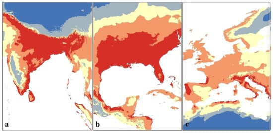 Potential current distribution of A. baumannii in (a) South Asia, (b) southeastern U.S., and (c) Europe.