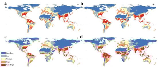 Calibration maps of the projected A. baumannii global distribution in (a) 2050 RCP 2.6, (b) 2050 RCP 8.5, (c) 2070 RCP 2.6, and (d) 2070 RCP 8.5.