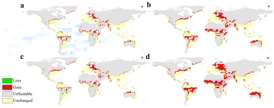 The maps were then classified into a presence–absence map using the same threshold used to calculate the TSS as previously mentioned, where zeroes represent absence points and ones represent presence points. To ease the interpretation of the future projected distribution maps, the maps were calibrated by subtracting the present–absent values of the current distribution maps from those of the future distribution maps [51]. This yielded a final raster map where positive values signify range gain, zeroes signify unaffected range, and negative values signify range loss. The classified maps were then color-coded and exported as well.