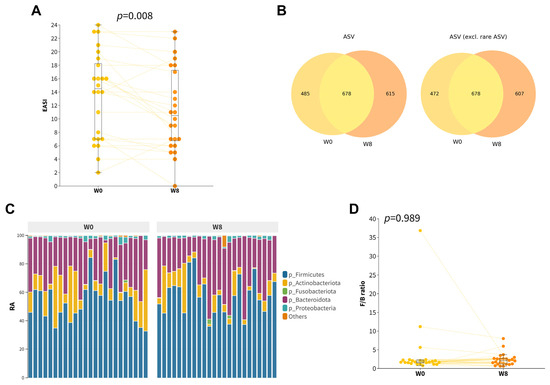 Gut composition profiles of childhood AD participants at baseline and at week 8. (A) Boxplot of the EASI scores of the participants. (B) Venn diagram of all ASVs (left) and with rare ASVs excluded (right) at baseline and week 8. Rare ASVs were defined as ASVs that occurred in only one of the samples. (C) Relative abundance of top five main phyla. (D) Boxplot of Firmicutes/Bacteroidetes (F/B) ratio.