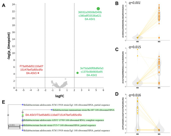 An exploratory analysis of differentially abundant units was conducted using ANCOM-BC2 at the ASV level. This analysis identified three differentially abundant ASVs, including two named species (DA−ASV1 and DA−ASV2) and one unnamed species (DA−ASV3), as detailed in Table 2. DA−ASV1 and DA−ASV2 were classified as Bacteroides fragilis and Lactobacillus acidophilus, respectively (Table S3). Higher (center-log-transformed, clr) relative abundances of DA−ASV1 (Figure 2B; q < 0.001) and DA−ASV2 (Figure 2C; q = 0.015) were observed at week eight, while a lower relative abundance of DA−ASV3 (Figure 2D) was observed after 8 weeks. MOLE-BLAST was employed to classify the DA−ASV3 unnamed Bifidobacterium species as closely related to Bifidobacterium adolescentis (Figure 2E). The increase in Lactobacillus acidophilus abundance was very likely due to the intake of synbiotics rich in Lactobacillus.