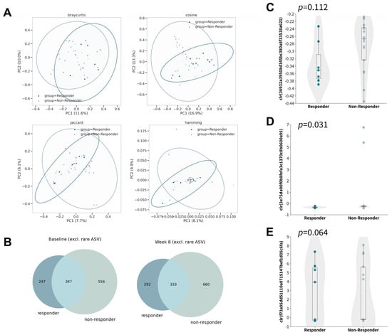 Gut microbiome compositions of responders and non-responders after 8 weeks of synbiotics. (A) Principal coordinate analysis based on Bray–Curtis (upper left), cosine (upper right), Jaccard (lower left), and Hamming distance (lower right). (B) Venn diagram of ASVs (excluding rare ASVs) at baseline (left) and week 8 (right). (C–E) Boxplot of center-log ratio (clr)-transformed abundance of DA−ASV at baseline (Mann–Whitney U).