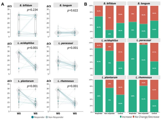 Real-time PCR of beneficial bacteria contained in the synbiotics mixture. (A) ∆Ct at baseline and week 8 (signed rank test regardless of responsiveness). (B) Proportion of participants within responsiveness subgroup who achieved increase in relative abundance of respective bacterial targets.