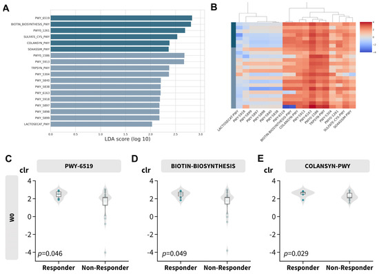 To investigate the biological implications of the gut microbiome profile, functional abundance was inferred using PICRUSt2 in conjunction with LefSe. This analysis identified 18 discriminative features with an absolute LDA score greater than 2, as depicted in Figure 5A,B and detailed in Table 3. Most of the features over-represented in the responder subgroup (Figure S7) were related to vitamin B synthesis, such as biotin (Figure 5C,D; PWY-6519 and BIOTIN-BIOSYNTHESIS) and colonic acid (COLANSYN-PWY). However, vitamin K or menaquinol-related pathways (including PWY-5840, PWY-5838, PWY-5897, PWY-5898, and PWY-5899) and L-tryptophan synthesis were disproportionately abundant in non-responders (TRPSYN-PWY and PWY-6163).