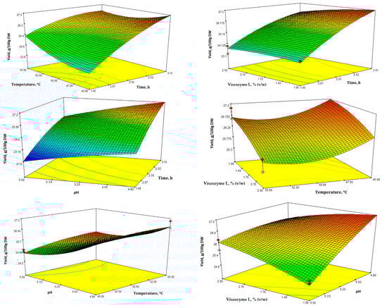 Response surface 3D plots for extraction yield (g/100 g DW) showing the effects of the four independent variables (temperature, time, enzyme concentration, and pH).
