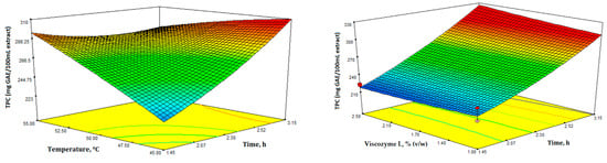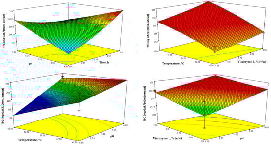 In Figure 3, the 3D response surface plots depict TPC as a function of the different independent variables. TPC was determined using the Folin-Ciocalteu assay and measured in mg of GAE/100 mL extract. Additionally, the TPC values ranged from 209.10 to 304.80 mg GAE/100 mL extract (Table 2).