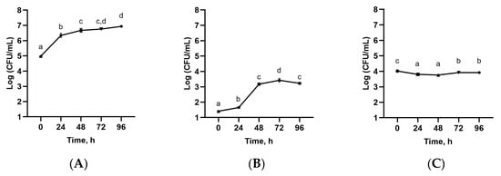 Evolution of viable cell numbers of LAB in enzyme-assisted extracts fermented with TKG; (A) mesophilic lactic acid bacteria; (B) Streptococcus thermophilus; (C) Lactobacillus delbrueckii subsp. bulgaricus. Different letters indicate significant differences (one-way ANOVA and Tukey’s HSD test, p < 0.05).