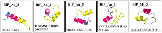 Overall, the five characterized invertebrate-derived peptides harbor the typical cationic structure with spatially separated hydrophobic and charged regions resulting in an amphipathic molecule that is probably crucial for their overall mode of action []. The molecular weights were calculated as <3 kDa (Table 1); thus, they were in the expected range through size exclusion, indicating typical binding interactions of small peptides with other molecules, such as receptors, enzymes, or proteins []. The isoelectric points of the peptides ranged between 8 and 12 (Table 1), reflecting that at a pH of 8–12, the peptides carry no net positive or negative charge. The pI of an AMP can influence its interactions with biological membranes, target cells, and other molecules. AMPs with positive charges are often attracted to negatively charged bacterial membranes, contributing to their antimicrobial activity []. Further, the aggregation propensity is associated with the formation of aggregates, which can lead to various issues, especially in biopharmaceutical and biotechnological applications. Primary structure, physicochemical properties, environmental conditions, concentration, and mechanical stress can influence the aggregation propensity of peptides []. A negative aggregation propensity value suggests that the molecule has a reduced tendency to aggregate, as shown for BiP_Aa_4 and BiP_Aa_6. It implies that the molecule is likelier to remain in its individual or monomeric state rather than form aggregates. A negative aggregation propensity can be favorable from a stability standpoint, as it indicates a lower risk of forming aggregates that could potentially lead to loss of function or other undesirable effects. In contrast, the remaining three identified peptides possess a positive aggregation propensity value, suggesting that the molecule has a higher tendency to aggregate, which could impact the molecule’s stability, solubility, and functionality. Peptides BiP_Aa_4 and BiP_Ml_3 showed a lower water solubility, which can be explained for BiP_Ml_3 by its aggregation propensity value of 0.561 (Table 1). Both increasing [,] as well as decreasing [,] antimicrobial properties have been described through peptide aggregation.