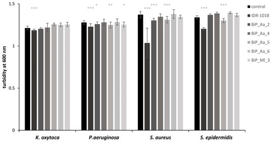 Exclusion of potential growth-inhibiting effects of the synthetic peptides on planktonic cells. K. oxytoca, P. aeruginosa, S. epidermidis, and S. aureus (3 × 108 cells/mL) were grown for 18 h in 200 µL LB medium at 80 rpm after adding 112.5 µg/mL of the synthetic peptides. Turbidity was monitored at 600 nm of two biological replicates, each with eight technical replicates, represented as the means with corresponding standard deviations. The growth effects (promoting and inhibiting) effects were compared to a control without the addition of peptide. Significant p-values are indicated only for growth-inhibiting effects: * p < 0.05, ** p < 0.01, and *** p < 0.001.