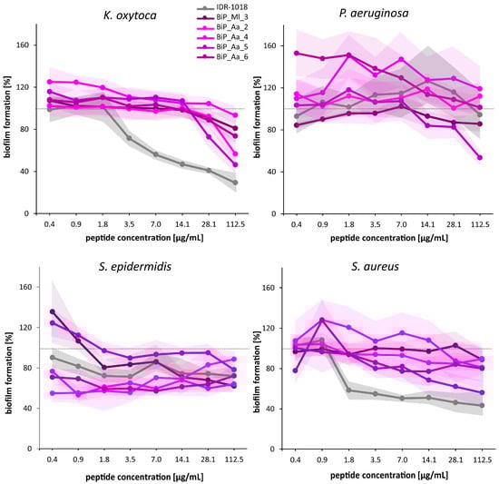 Biofilm-preventing effects of synthetic peptides on static pathogenic biofilms. Biofilm-forming strains K. oxytoca, P. aeruginosa, S. epidermidis, and S. aureus (3 × 108 cells/mL) were grown for 18 h in 200 µL Caso Bouilion. Synthetic peptides were added from the beginning in concentrations of 0.4, 0.9, 1.8, 3.5, 7.0, 14.1, 28.1, and 112.5 µg/mL. Diagrams represent the average of three biological replicates, each with eight technical replicates. Biofilm formation was quantified using the crystal violet assay. The biofilm-preventing effect was calculated as a percentage value compared to the biofilm control (100%, dashed line); standard deviations are depicted as cloud envelopes.