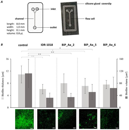 In the first attempt, microfluidic flow cells were constructed and established for the biofilm formation of our biofilm model organism and opportunistic pathogen K. oxytoca (Figure 4A). A comprehensive biofilm formation of K. oxytoca was reached with an initial cell concentration of 8 × 105 cells/channel and a flow rate of 15 µL/h for 24 h at 30 °C. A compact biofilm with a wavy surface was formed with a mean biofilm thickness of 11 ± 6 µm (Figure 4B, left bar) and volume of 112 ± 62 µm3 (Figure 4B, right bar, medium control). In a second step, the biofilm formation of K. oxytoca was analyzed in the presence of the synthetic host-derived peptides BiP_Aa_2, BiP_Aa_5, and BiP_Aa_6 and the control peptide IDR-1018 (10 ng/channel) with four biological replicates, each with four technical replicates (Figure 4B). In contrast to the medium control, the control peptide IDR-1018 significantly prevented biofilm formation. Predominantly, microcolonies but no 3D structures were detected, resulting in a reduced maximum thickness of 6 ± 2 µm (p = 0.0036; Figure 4B, left bar) and a reduced volume of 32 ± 16 µm3 (p = 0.0046; Figure 4B, right bar) Using the two host-derived synthetic peptides, BiP_Aa_2 and BiP_Aa_5, strong biofilm-preventing effects were observed, confirming the findings for static K. oxytoca biofilms. Single cells attached to the surface and formed microcolonies of 8 ± 3 µm (p = 0.1349; Figure 4B, left bar), resulting in a volume for BiP_Aa_2 of 34 ± 12 µm3 (0.0046; Figure 4B, right bar). Similarly, BiP_Aa_5 formed 7 ± 2 thick biofilms (p = 0.0342; Figure 4B, left bar) with a volume of 51 ± 25 µm3 (p = 0.0309; Figure 4B, right bar). The smallest effect was observed for BiP_Aa_6. Here, the formation of macrocolonies was detected, which reached a thickness of up to 8 ± 1 µm (p = 0.0674; Figure 4B, left bar) and a volume of 64 ± 36 µm3 (p = 0.1443; Figure 4B, right bar). However, those macrocolonies did not show a compact structure like that observed in the medium control (Figure 4B). Consequently, all tested synthetic peptides showed inhibitory effects on the dynamic biofilm formation of K. oxytoca in flow cells leading to a reduced biofilm thickness and volume.