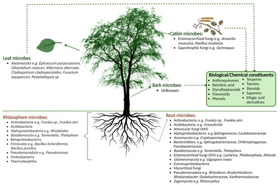 Overview of microbial communities present in different compartments of the Alnus species based on published literature (Created with BioRender.com, accessed on 1 February 2023).