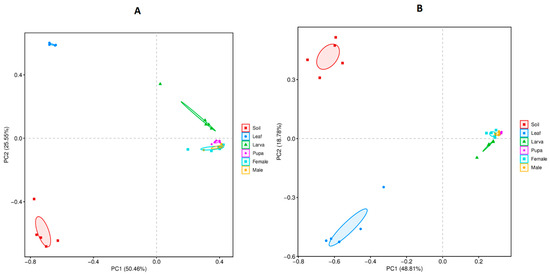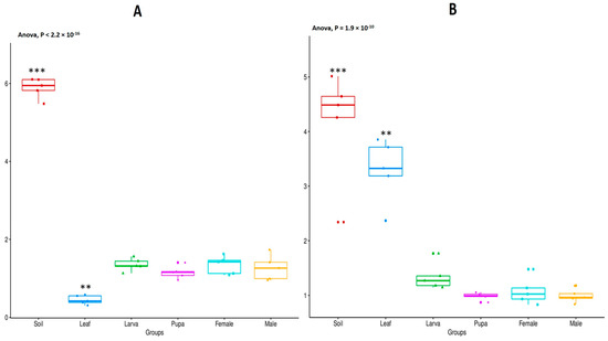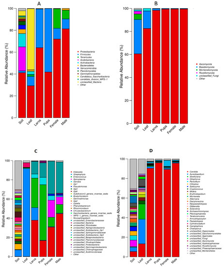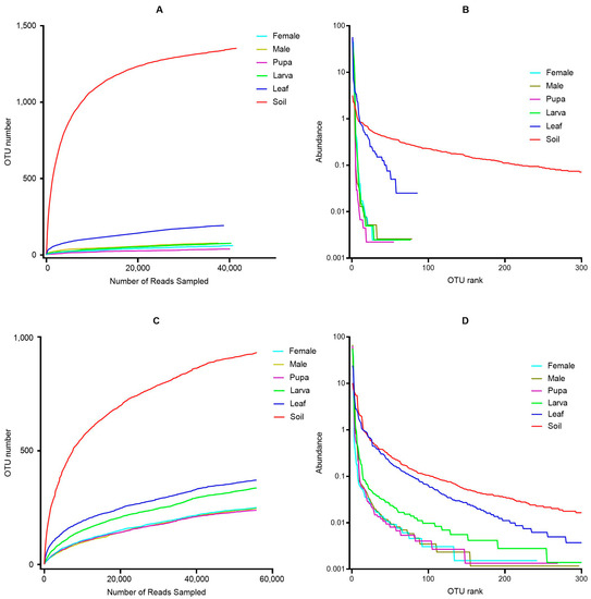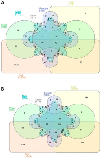 - Hannula, S.E.; Zhu, F.; Heinen, R.; Bezemer, T.M. Foliar-Feeding Insects Acquire Microbiomes from the Soil Rather than the Host Plant. Nat. Commun. 2019, 10, 1254. [Google Scholar] [CrossRef] [PubMed]