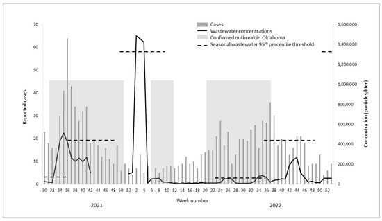 Temporal association between outbreaks indicated in wastewater and reported outbreaks *, Oklahoma 2021–2022.