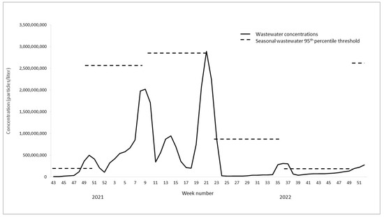 Using the defined seasonal thresholds of 95th percentiles, we observed 28 weeks where wastewater concentrations indicated an ‘outbreak’—i.e., exceeding the seasonal 95th percentile (Table 2). The seasonal thresholds represent the second ‘outbreak indicator’ in Figure 1, Figure 2 and Figure 3, shown as dotted lines in each season for each pathogen. Of the twenty-eight ‘outbreak’ weeks, nine (32%) matched in time with confirmed Salmonella or Campylobacter outbreaks reported no later than two weeks after the exceeded wastewater threshold. Out of eleven weeks with Salmonella ‘wastewater outbreak’ alerts, nine (82%) matched in time with a reported outbreak. One wastewater alert for Salmonella matched in time with an outbreak of unknown etiology (Table 2). None of the wastewater alerts for Campylobacter matched in time with a confirmed campylobacteriosis outbreak; however, two weeks of elevated Campylobacter concentrations in wastewater correlated with a reported gastrointestinal outbreak of unknown etiology (Table 2). Of the twenty-two weeks with reported gastrointestinal outbreaks without a confirmed pathogen, five (23%) matched in time with an outbreak alert for norovirus alone (Table 2). Overall, 41% of the weeks with a confirmed gastrointestinal outbreak of unknown etiology matched in time with wastewater alerts for either Salmonella, Campylobacter, or norovirus (Table 2).