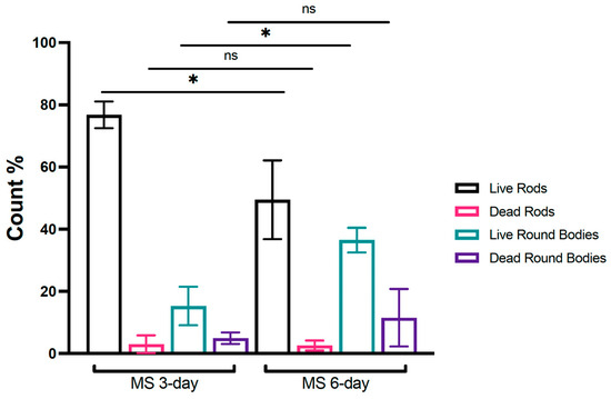 Quantification of rods and round bodies in 3- and 6-day-old Mucispirillum schaedleri cultures. MS 3-day and 6-day cultures; n = 4 independent experiments. All values are presented as the mean ± standard deviation (SD), * p < 0.05 was considered significant. MS, Mucispirillum schaedleri; ns, not significant.