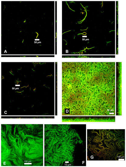M. schaedleri ASF 457 presented a striking biofilm morphology. When grown in AMM/NO3 medium, it displayed large rope-like structures resembling masses of the closely appressed cells seen in planktonic broth culture; these structures will be termed cords. After 48 h of growth, cords were much larger than after 18 h of growth (Figure 3A–D), and surface coverage was much higher in the continuous culture system of flowcells than under static conditions in chamber slides. The biofilm morphology overall is the same as cording documented in mycobacterial biofilms, here shown in M. bovis biofilms grown as part of the present study (Figure 3E,F), as well as in M. marinum biofilms from different studies [38,39] (Figure 3G). Image analysis (Figure 4) demonstrated that the average biovolume per field of view in chambers increased 3-fold between 18 and 48 h (reaching 4.0 × 104 µm3), and maximum biofilm height (measured as the height at which cells were no longer visible in the microscope) increased 1.8-fold (reaching 28.2 µm). In contrast, biovolume in flowcell-grown biofilms increased 40-fold (reaching 4.3 × 105 µm3), and maximum height increased 2.4-fold (reaching 64.9 µm). At 18 h of growth, high standard deviation was apparent in average biovolume measurements for flowcell-grown biofilms, whereas the range of initial biovolumes in chamber-grown biofilms was comparatively narrow. However, by 48 h, flowcell-grown biofilms had reached confluence, whereas chamber biofilms still had uncolonized areas (Figure 3).